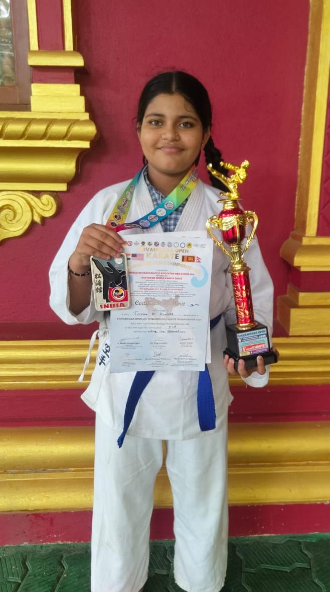 ಉಡುಪಿ : ಶಿವಮೊಗ್ಗದಲ್ಲಿ ನಡೆದ ‘ಶಿವಮೊಗ್ಗ ಓಪನ್ 6ನೇ ಅಂತಾರಾಷ್ಟ್ರೀಯ ಕರಾಟೆ ಸ್ಪರ್ಧಾ ಕೂಟ’ದಲ್ಲಿ ಮಲ್ಪೆ ಶ್ರೀ ನಾರಾಯಣಗುರು ಆಂಗ್ಲ ಮಾಧ್ಯಮ ಶಾಲೆಯ 7ನೇ ತರಗತಿಯ ವಿದ್ಯಾರ್ಥಿನಿ ತ್ವಿಷಾ ಕುಂದರ್ ಇವರು ಕುಮಿಟೆ ವಿಭಾಗದಲ್ಲಿ ಚಿನ್ನದ ಪದಕ ಹಾಗೂ ಕಟ ವಿಭಾಗದಲ್ಲಿ ಬೆಳ್ಳಿಯ ಪದಕವನ್ನು ಪಡೆದುಕೊಂಡಿರುತ್ತಾರೆ.