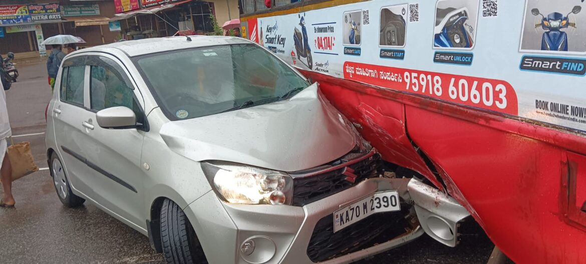 ಉಡುಪಿಯಿಂದ ಬೆಳಗಾಂ ಕಡೆಗೆ ತೆರಳುತ್ತಿದ್ದ ಕೆ ಎಸ್ ಆರ್ ಟಿ ಸಿ ಬಸ್ ಹಾಗೂ ವಿಟ್ಲದ ಅಡ್ಯನಡ್ಕ ಕಡೆಯಿಂದ ಅದೇ ಮಾರ್ಗವಾಗಿ ಬಂದ ಮಾರುತಿ ಸಿಲಾರಿಯೊ ಕಾರು ಸಂತೆ ಮಾರ್ಕೇಟ್ ಜಂಕ್ಷನ್ ಬಳಿ ಬಸ್ಗೆ ಢಿಕ್ಕಿ ಹೊಡಿದಿದ್ದು ಕಾರಿನಲ್ಲಿದ್ದ ಐವರ ಪೈಕಿ ಮಹಿಳೆಯೋರ್ವರಿಗೆ ಹಣೆಗೆ ಗಾಯವಾಗಿದೆ
