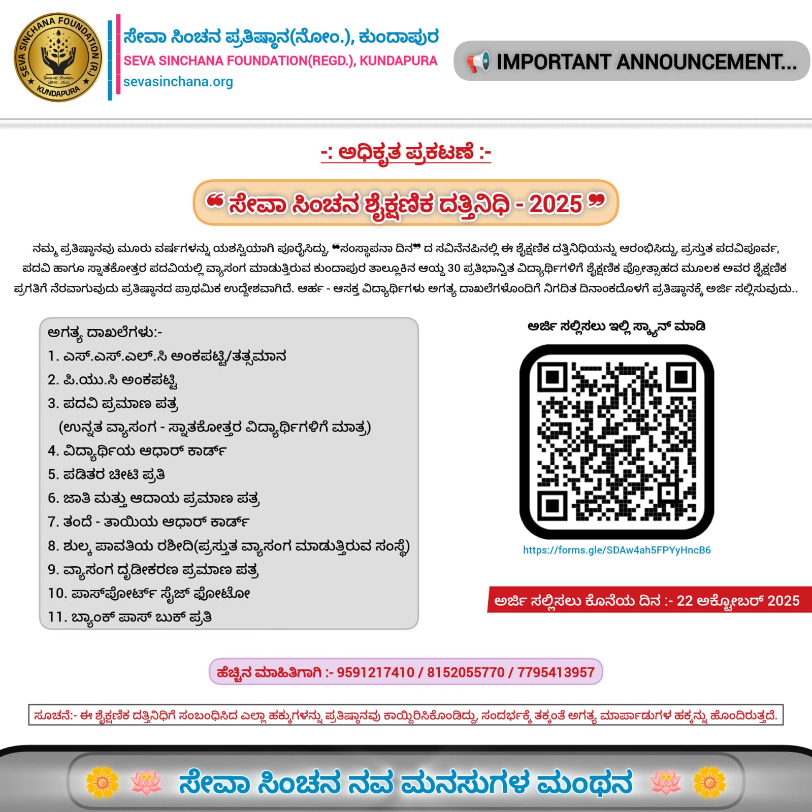 ಕುಂದಾಪುರ : ಸೇವಾ ಸಿಂಚನ ಪ್ರತಿಷ್ಠಾನವು ತನ್ನ ಮೂರನೇ ವರ್ಷದ ಯಶಸ್ವಿ ಸಂಸ್ಥಾಪನಾ ದಿನದ ಸವಿನೆನಪಿನಲ್ಲಿ 2025ರ ಶೈಕ್ಷಣಿಕ ದತ್ತಿನಿಧಿಯನ್ನು ಘೋಷಿಸಿದೆ. ಕುಂದಾಪುರ ತಾಲ್ಲೂಕು ವ್ಯಾಪ್ತಿಯ ಪದವಿ ಪೂರ್ವ, ಪದವಿ ಹಾಗೂ ಸ್ನಾತಕೋತ್ತರ ಪದವಿಯಲ್ಲಿ ವ್ಯಾಸಂಗ ಮಾಡುತ್ತಿರುವ 30 ಪ್ರತಿಭಾನ್ವಿತ ವಿದ್ಯಾರ್ಥಿಗಳಿಗೆ ಶೈಕ್ಷಣಿಕ ಪ್ರೋತ್ಸಾಹವನ್ನು ನೀಡಿ ಅವರ ಶೈಕ್ಷಣಿಕ ಪ್ರಗತಿಗೆ ಸಹಕಾರಿಯಾಗುವುದು ಈ ದತ್ತಿನಿಧಿಯ ಮುಖ್ಯ ಉದ್ದೇಶವಾಗಿದೆ.