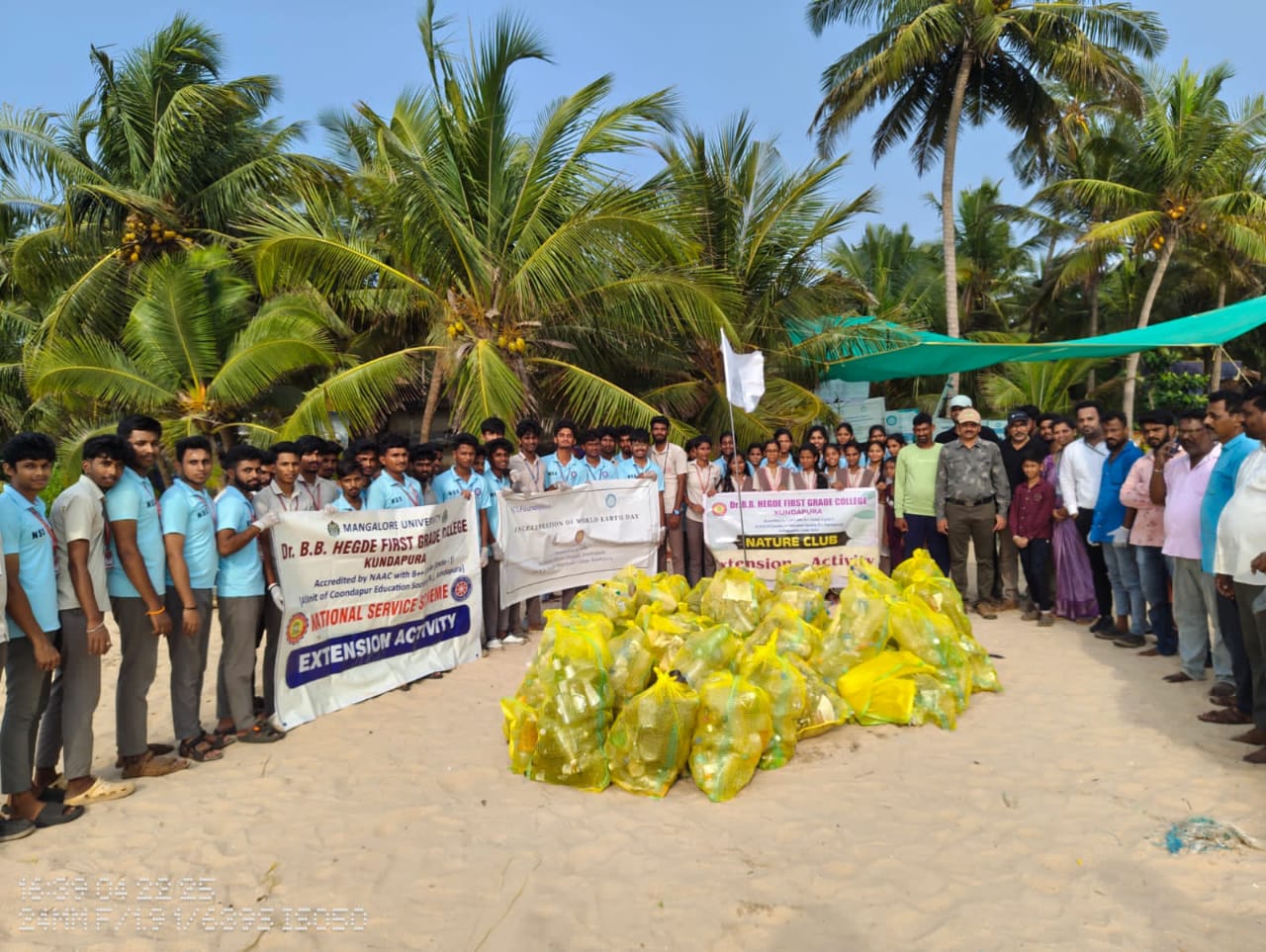 ಕುಂದಾಪುರ : ಕುಂದಾಪುರದ ಡಾ. ಬಿ.ಬಿ. ಹೆಗ್ಡೆ ಪ್ರಥಮ ದರ್ಜೆ ಕಾಲೇಜಿನ ರಾಷ್ಟ್ರೀಯ ಸೇವಾ ಯೋಜನಾ ಘಟಕ ಮತ್ತು ನೇಚರ್ ಕ್ಲಬ್ ಜಂಟಿ ಆಶ್ರಯದಲ್ಲಿ ರೀಫ್ ವಾಚ್ ಮರೈನ್ ಸಂಸ್ಥೆ ಸಹಯೋಗದೊಂದಿಗೆ, ಎಚ್.ಸಿಎಲ್ ಫೌಂಡೇಶನ್ ಹಾಗೂ ಸ್ಥಳೀಯ ಭಜನಾ ಮಂಡಳಿ ಮತ್ತು ಮೀನುಗಾರರ ಸಹಕಾರದೊಂದಿಗೆ ಏಪ್ರಿಲ್ 22ರಂದು ವಿಶ್ವ ಭೂಮಿಯ ದಿನ ಆಚರಣೆಯ ಅಂಗವಾಗಿ ಕಂಚುಗೋಡಿನ ಕಡಲ ತೀರದಲ್ಲಿ ಸ್ವಚ್ಛತಾ ಕಾರ್ಯಕ್ರಮ ಹಮ್ಮಿಕೊಳ್ಳಲಾಯಿತು.