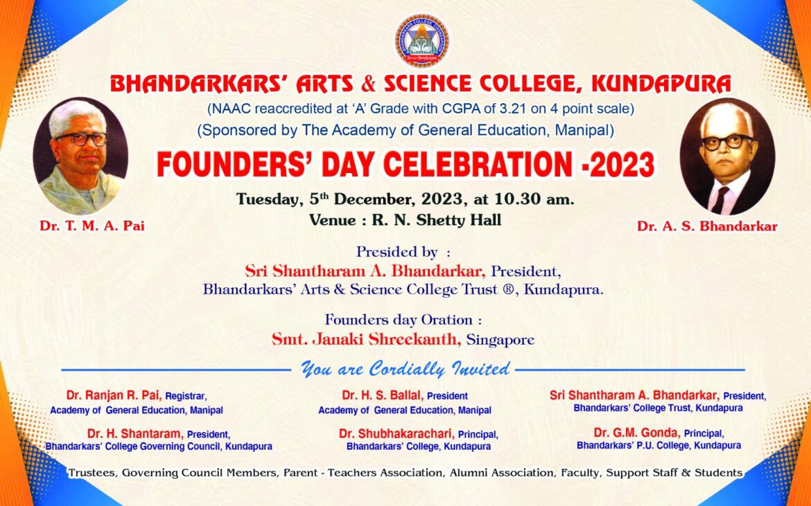 ಕುಂದಾಪುರ: ಇಲ್ಲಿನ ಭಂಡಾರ್ಕಾರ್ಸ್ ಆರ್ಟ್ಸ್ ಮತ್ತು ಸೈನ್ಸ್ ಕಾಲೇಜಿನ ಸಂಸ್ಥಾಪಕರ ದಿನಾಚರಣೆಯು ಇಂದು ನಡೆಯಲಿದೆ ಭಂಡಾರ್ಕಾರ್ಸ್ ಆರ್ಟ್ಸ್ ಮತ್ತು ಸೈನ್ಸ್ ಕಾಲೇಜು ಟ್ರಸ್ಟ್ ಇದರ ಅಧ್ಯಕ್ಷರಾದ ಶಾಂತಾರಾಮ್ ಭಂಡಾರ್ಕರ್ ಅವರು ಕಾರ್ಯಕ್ರಮದ ಅಧ್ಯಕ್ಷತೆಯನ್ನು ವಹಿಸಲಿದ್ದಾರೆ.