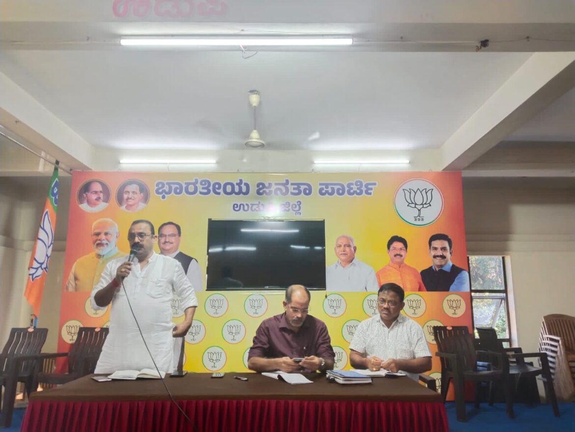 ಉಡುಪಿ : ಜಿಲ್ಲಾ ಬಿಜೆಪಿ ಪದಾಧಿಕಾರಿಗಳ ಸಭೆಯು ಜಿಲ್ಲಾ ಅಧ್ಯಕ್ಷರಾದ ಬಿ ಕಿಶೋರ್ ಕುಮಾರ್ ರವರ ಅದ್ಯಕ್ಷತೆಯಲ್ಲಿ ಜಿಲ್ಲಾ ಕಚೇರಿಯಲ್ಲಿ ನಡೆಯಿತು ಪಕ್ಷದ ಕಾರ್ಯಕ್ರಮಗಳಾದ 2024 ರಲ್ಲಿ ಮೋದಿ ಮತ್ತೊಮ್ಮೆ ಗೋಡೆಬರಹ, ಗ್ರಾಮ ಚಲೋ ಅಭಿಯಾನ, ಅಯೋದ್ಯೆ ಮಂದಿರ ದರ್ಶನ ಕಾರ್ಯಕ್ರಮ, ಮತ್ತು ಪಕ್ಷ ಸೇರ್ಪಡೆ ಹಾಗೂ ಇನ್ನಿತರ ವಿಚಾರಗಳಲ್ಲಿ ಇದುವರೆಗೆ ಮಾಡಿರುವ ಪ್ರಗತಿಯ ಬಗ್ಗೆ ವಿಚಾರ ವಿನಿಮಯ ಮಾಡಲಾಯಿತು. ಈ ಎಲ್ಲಾ ಕಾರ್ಯಕ್ರಮಗಳನ್ನು ಇನ್ನಷ್ಟು ಪರಿಣಾಮಕಾರಿಯಾಗಿ ಜಿಲ್ಲೆಯಲ್ಲಿ ಅನುಷ್ಠಾನ ಮಾಡಿ ಪಕ್ಷವನ್ನು ಬೆಳೆಸಲು ಪದಾಧಿಕಾರಿಗಳ ಸಹಕಾರವನ್ನು ಯಾಚಿಸಲಾಯಿತು ವೇದಿಕೆಯಲ್ಲಿ ವಿಭಾಗ ಪ್ರಭಾರಿ ಉದಯ ಕುಮಾರ್ ಶೆಟ್ಟಿ, ನಿಕಟ ಪೂರ್ವ ಅಧ್ಯಕ್ಷ ಕುಯಿಲಾಡಿ ಸುರೇಶ್ ನಾಯಕ್, ಪ್ರಧಾನ ಕಾರ್ಯದರ್ಶಿ ಸದಾನಂದ ಉಪ್ಪಿನಕುದ್ರು ಉಪಸ್ಥಿತರಿದ್ದರು