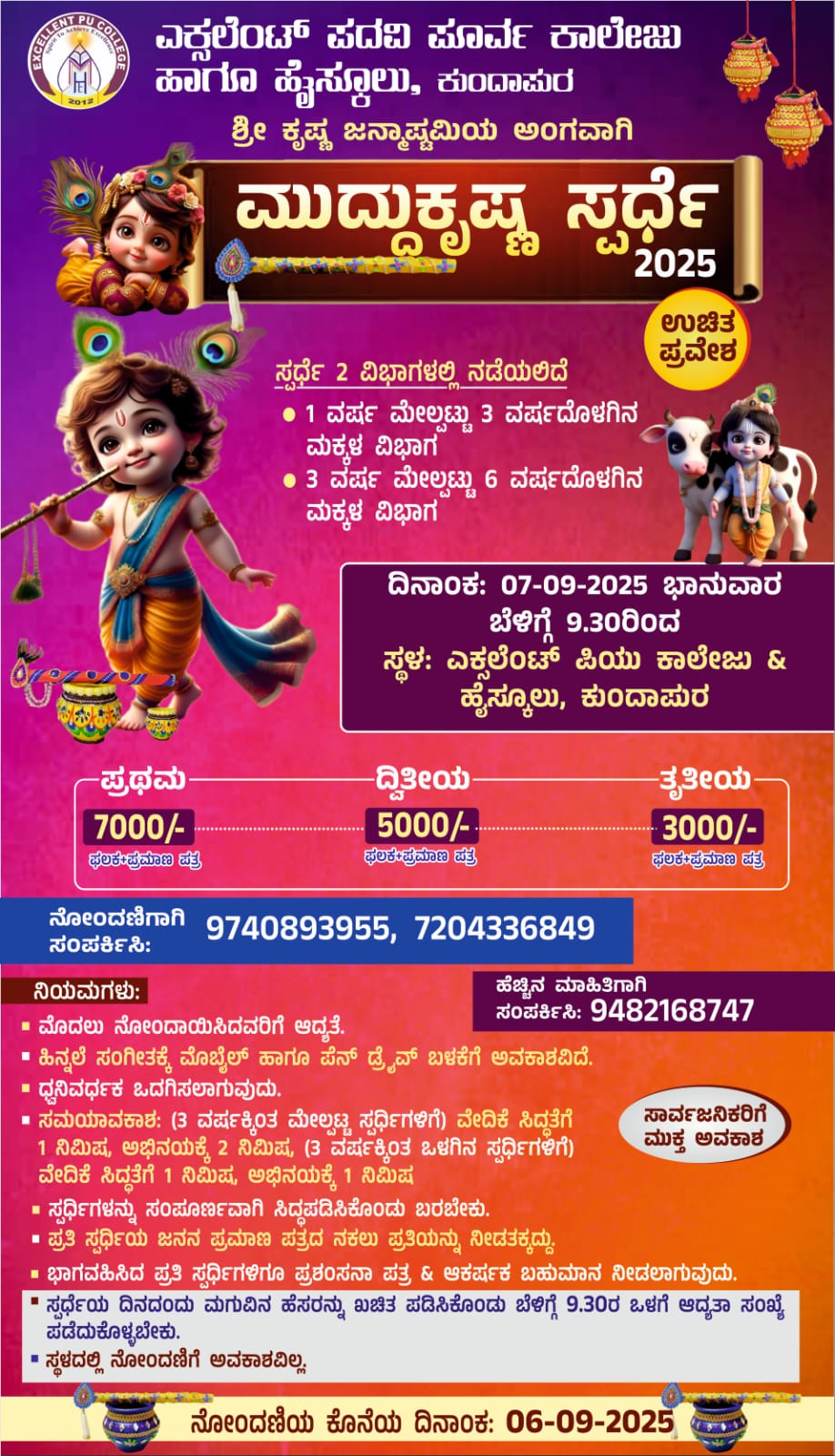 ಈ ಸ್ಪರ್ಧೆಯು ಎರಡು ವಿಭಾಗಗಳಲ್ಲಿ ನಡೆಯಲಿದ್ದು, 1 ರಿಂದ 3 ವರ್ಷದೊಳಗಿನ ಹಾಗೂ 3 ವರ್ಷ ಮೇಲ್ಪಟ್ಟು 6 ವರ್ಷದೊಳಗಿನ ಮಕ್ಕಳಿಗೆ ಸಂಸ್ಥೆಯ ನಿಯಮಗಳಿಗನುಗುಣವಾಗಿ ಪ್ರಥಮ 7,000/-, ದ್ವಿತೀಯ 5,000/-, ತೃತೀಯ 3,000/-ಗಳೊಂದಿಗೆ ನಡೆಸಲು ತೀರ್ಮಾನಿಸಿದ್ದಾರೆ.. ಭಾಗವಹಿಸುವ ಪ್ರತಿ ಮಗುವಿಗೂ ಸಹ ಪ್ರಶಂಸನಾ ಪತ್ರದೊಂದಿಗೆ ಆಕರ್ಷಕ ಬಹುಮಾನಗಳನ್ನು ನೀಡುವ ಸಂಕಲ್ಪವನ್ನು ಮಾಡಿರುತ್ತಾರೆ. ನಮ್ಮ ಈ ನಾಡಿನ ಸಮಸ್ತ ಜನತೆಯು ಈ ಭಗವಂತನ ಲೀಲೆಗಳನ್ನು ಪ್ರಚುರಪಡಿಸುವ “ಈ ನಮ್ಮ ಎಕ್ಸಲೆಂಟ್ ಆವರಣದ ವೇದಿಕೆಯ ಚಿಣ್ಣರ ಅಂಗಳಕ್ಕೆ ಆಗಮಿಸುವಂತೆ ಆತ್ಮೀಯ ಕರೆಯೋಲೆಯನ್ನು ನೀಡುತ್ತಿದ್ದೇವೆ ಬನ್ನಿ ನಿಮ್ಮ ಮಕ್ಕಳೊಂದಿಗೆ ಈ ಸುಂದರ ಕಾರ್ಯಕ್ರಮವನ್ನು ಚಂದಗಾಣಿಸಿ” ಎನ್ನುವ ಆಶಯಗಳೊಂದಿಗೆ, ಆಡಳಿತಮಂಡಳಿ, ಪ್ರಾಂಶುಪಾಲರು, ಮುಖ್ಯೋಪಾಧ್ಯಾಯರು ಹಾಗೂ ಬೋಧಕ – ಬೋಧಕೇತರ ಸಿಬ್ಬಂಧಿ ವರ್ಗದವರು ಎಕ್ಸಲೆಂಟ್ ಪದವಿ ಪೂರ್ವ ಕಾಲೇಜು & ಹೈಸ್ಕೂಲ್ ಸುಣ್ಣಾರಿ, ಕುಂದಾಪುರ ತಿಳಿಸಿದ್ದಾರೆ