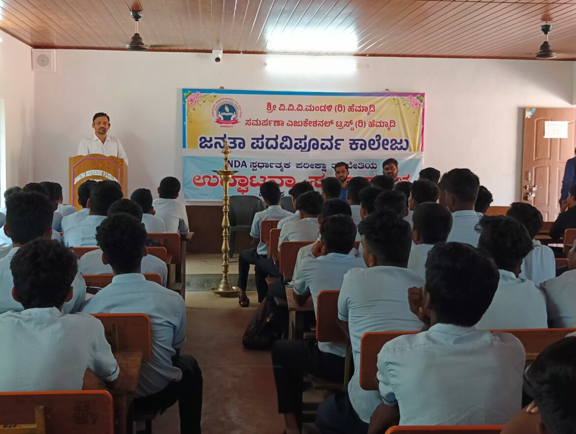 ಹೆಮ್ಮಾಡಿ : ಜನತಾ ಪದವಿಪೂರ್ವ ಕಾಲೇಜು ಹೆಮ್ಮಾಡಿಯಲ್ಲಿ NDA ಸ್ಪರ್ಧಾತ್ಮಕ ಪರೀಕ್ಷೆಯ ತರಬೇತಿಯ ಉದ್ಘಾಟನೆಯನ್ನುNDA ಪರೀಕ್ಷಾ ತರಬೇತುದಾರರು,ಸಂಪನ್ಮೂಲ ವ್ಯಕ್ತಿಗಳು ಆಗಿರುವ ಶ್ರೀ ಅಶ್ವಿನ್ ವಿಗಾಸ್ ರವರು ನೆರವೇರಿಸಿ, ಸ್ಪರ್ಧಾತ್ಮಕ ಪರೀಕ್ಷೆಯ ಕುರಿತಾಗಿ ಮಾಹಿತಿಯನ್ನು ನೀಡಿದರು.ಸಮಾರಂಭದಲ್ಲಿ ಕಾಲೇಜಿನ ಗಣಿತ ವಿಭಾಗದ ಮುಖ್ಯಸ್ಥರಾದ ಶ್ರೀ ರಾಘವೇಂದ್ರ ನಾಯ್ಕ,ಆಂಗ್ಲ ಭಾಷಾ ವಿಭಾಗದ ಮುಖ್ಯಸ್ಥರಾದ ಶ್ರೀ ಜ್ಞಾನಶೇಖರನ್,ಗಣಕಯಂತ್ರ ವಿಭಾಗದ ಮುಖ್ಯಸ್ಥರಾದ ಶ್ರೀ ಶ್ರೀ ಸುಜಯ್ ಉಪಸ್ಥಿತರಿದ್ದರು.ವಿದ್ಯಾರ್ಥಿಗಳು,ಬೋಧಕ/ಬೋಧಕೇತರ ವೃಂದದವರು ಉಪಸ್ಥಿತರಿದ್ದರು. ಉಪನ್ಯಾಸಕ ಉದಯ ನಾಯ್ಕ ಕಾರ್ಯಕ್ರಮ ನಿರ್ವಹಿಸಿದರು.