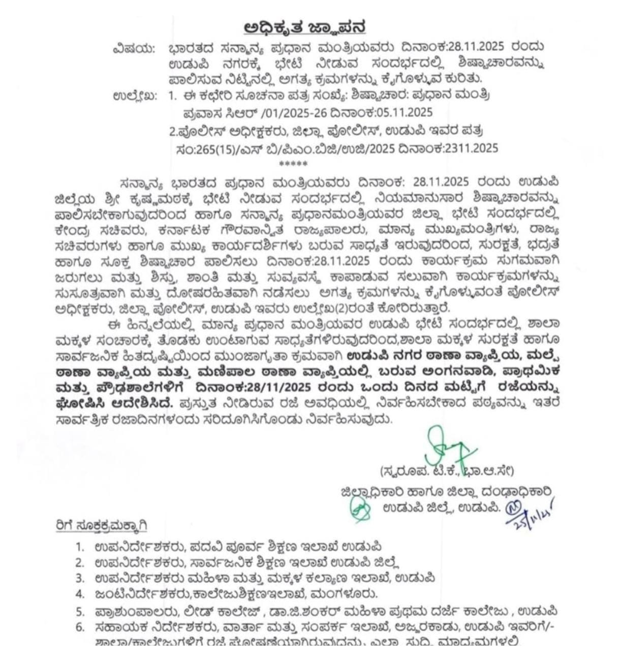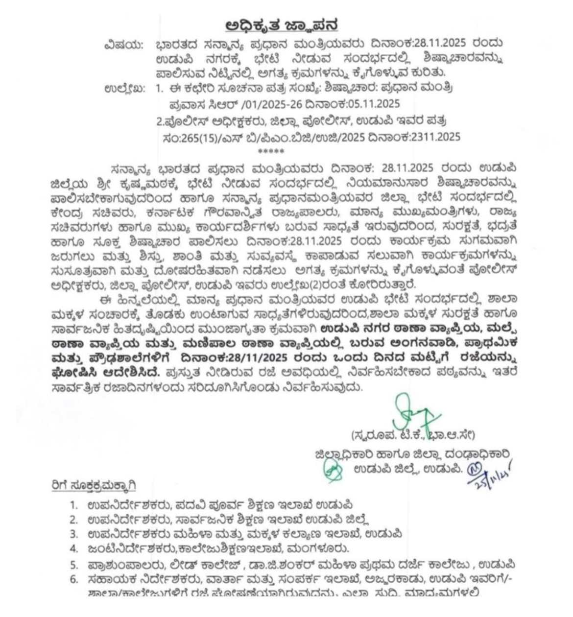 ಉಡುಪಿ: ಪ್ರಧಾನಿ ನರೇಂದ್ರ ಮೋದಿ ಉಡುಪಿಗೆ ಭೇಟಿ ನೀಡಲಿರುವ ಹಿನ್ನೆಲೆಯಲ್ಲಿ ಕಾನೂನು ಸುವ್ಯವಸ್ಥೆ ಕಾಪಾಡುವ ನಿಟ್ಟಿನಲ್ಲಿ ನವೆಂಬರ್ 28ರಂದು ಉಡುಪಿ ನಗರ ಠಾಣಾ ವ್ಯಾಪ್ತಿ, ಮಲ್ಪೆ ಠಾಣಾ ವ್ಯಾಪ್ತಿ ಹಾಗೂ ಮಣಿಪಾಲ ಠಾಣಾ ವ್ಯಾಪ್ತಿಯ ಅಂಗನವಾಡಿ, ಪ್ರಾಥಮಿಕ ಹಾಗೂ ಪ್ರೌಢಶಾಲೆಗಳಿಗೆ ರಜೆ ಘೋಷಿಸಿ ಜಿಲ್ಲಾಧಿಕಾರಿ ಸ್ವರೂಪ ಅವರು ಆದೇಶಿಸಿದ್ದಾರೆ. ಕಾನೂನು ಸುವ್ಯವಸ್ಥೆ ಹಾಗೂ ಮಕ್ಕಳ ಸುರಕ್ಷತೆ ದೃಷ್ಟಿಯಿಂದ ರಜೆ ಘೋಷಣೆ ಮಾಡಲಾಗಿದೆ ಎಂದು ಜಿಲ್ಲಾಧಿಕಾರಿ ಪ್ರಕಟಣೆಯಲ್ಲಿ ತಿಳಿಸಿದ್ದಾರೆ.