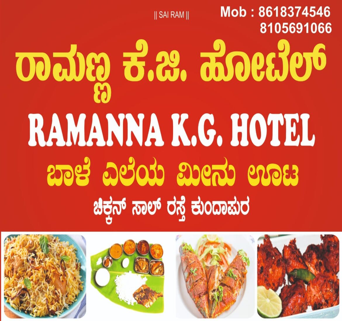 ಕುಂದಾಪುರ : ನಗರದ ಚಿಕ್ಕನ್ಸಾಲ್ ರಸ್ತೆಯಲ್ಲಿರುವ ಕ್ರಾಸ್ತಾ ಇಂಜೀನಿಯರಿಂಗ್ ವರ್ಕ್ಸ್ ಬಳಿಯಲ್ಲಿ ರಾಮಣ್ಣ ಕೆ ಜಿ ಹೋಟೆಲ್ ಶುಭಾರಂಭಗೊಂಡಿತು ಸುಚೇಂದ್ರ ಕೆ ಜಿ ಹಾಗೂ ಸೂರಜ್ ಕೆ ಜಿ ಯವರ ಮಾಲಕತ್ವದ ಈ ಬಾಳೆ ಎಲೆ ಮೀನು ಊಟದ ಹೋಟೆಲ್ ನಲ್ಲಿ ಮಿತ ದರದಲ್ಲಿ ಅತ್ಯುತ್ತಮ ಗುಣಮಟ್ಟದ ಆಹಾರವನ್ನು ಗ್ರಾಹಕರಿಗೆ ವಿತರಿಸಲಾಗುತ್ತದೆ