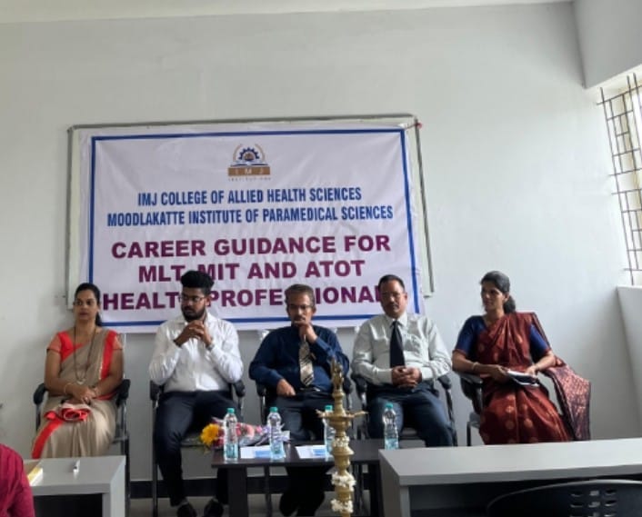 ಮೂಡ್ಲಕಟ್ಟೆ : ಐಎಂಜೆ ಕಾಲೇಜ್ ಆಫ್ ಅಲೈಡ್ ಹೆಲ್ತ್ ಸೈನ್ಸಸ್ ಮತ್ತು ಮೂಡ್ಲಕಟ್ಟೆ ಪ್ಯಾರಾಮೆಡಿಕಲ್ ವಿಜ್ಞಾನ ಸಂಸ್ಥೆಯಲ್ಲಿ ವಿದ್ಯಾರ್ಥಿಗಳಿಗಾಗಿ ವೃತ್ತಿ ಮಾರ್ಗದರ್ಶನ ತರಬೇತಿ ಆಯೋಜಿಸಲಾಗಿತ್ತು. ಈ ಕಾರ್ಯಕ್ರಮವನ್ನು ಮುಖ್ಯ ಅತಿಥಿ ಶ್ರೀ ಸ್ವರಾಜ್ ಶೆಟ್ಟಿ (ರೇಡಿಯೋ ಟೆಕ್ನಾಲಜಿಸ್ಟ್ ಮತ್ತು ಉದ್ಯಮಿ) ಅವರು ದೀಪ ಬಳಗಿಸಿ ಉದ್ಘಾಟಿಸಿದರು. ವೇದಿಕೆಯಲ್ಲಿ ಐಎಂಜೆ ಇನ್ಸ್ಟಿಟ್ಯೂಟ್ ಆಫ್ ಅಲೈಡ್ ಹೆಲ್ತ್ ಸೈನ್ಸಸ್ನ ಡೀನ್,ಡಾ. ಪದ್ಮಚಾರಣ ಸ್ವೈನ್, ಐಎಂಜೆ ಇನ್ಸ್ಟಿಟ್ಯೂಟ್ಗಳ ಬ್ರ್ಯಾಂಡ್ ಬಿಲ್ಡಿಂಗ್ ನಿರ್ದೇಶಕರು ಡಾ. ರಾಮಕೃಷ್ಣ ಹೆಗ್ಡೆ, ಮೂಡ್ಲಕಟ್ಟೆ ನರ್ಸಿಂಗ್ ಕಾಲೇಜಿನ ಪ್ರಿನ್ಸಿಪಾಲ್ ಶ್ರೀಮತಿ ಜೆನಿಫರ್ ಫ್ರೀಡಾ ಮೆನೆಜಸ್ , ಐಎಂಜೆ ಅಲೈಡ್ ಹೆಲ್ತ್ ಸೈನ್ಸಸ್ ಹಾಗೂ ಮೂಡ್ಲಕಟ್ಟೆ ಪ್ಯಾರಾಮೆಡಿಕಲ್ ವಿಜ್ಞಾನ ಸಂಸ್ಥೆಗಳ ಉಪಪ್ರಾಂಶುಪಾಲರಾದ ಶ್ರೀಮತಿ ಸೌಜನ್ಯಾ ಉಪಸ್ಥಿತರಿದ್ದರು.