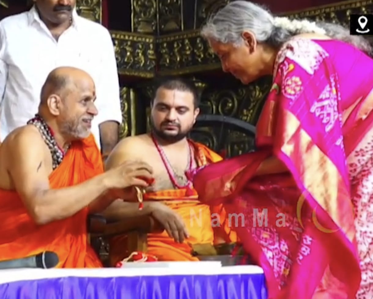 ಉಡುಪಿ : ಕೇಂದ್ರ ಹಣಕಾಸು ಸಚಿವೆ ನಿರ್ಮಲಾ ಸೀತಾರಾಮನ್ ಅವರಿಗೆ ಉಡುಪಿ ಕೃಷ್ಣಮಠದಲ್ಲಿ ಪರ್ಯಾಯ ಪುತ್ತಿಗೆ ಮಠದ ಶ್ರೀ ಸುಗುಣೇಂದ್ರ ತೀರ್ಥ ಶ್ರೀಪಾದರು ಭಾರತ ಲಕ್ಷ್ಮೀ ಬಿರುದು ನೀಡಿ ಸನ್ಮಾನಿಸಿದರು.