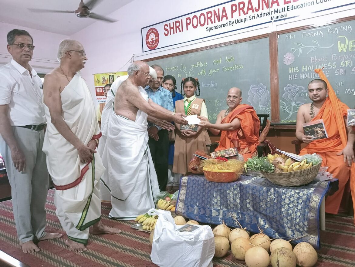 ಮುಂಬೈ : ಮುಂಬೈ ನ ದಹಿಸರ್ ನಲ್ಲಿರುವ ಶ್ರೀ ಪೂರ್ಣಪ್ರಜ್ಞ ಶಿಕ್ಷಣ ಕೇಂದ್ರಕ್ಕೆ ಭಾವೀ ಪರ್ಯಾಯ ಶ್ರೀಗಳಾದ ಪುತ್ತಿಗೆ ಮಠದ ಶ್ರೀ ಸುಗುಣೇಂದ್ರ ತೀರ್ಥ ಶ್ರೀಪಾದರನ್ನು ಹಾಗೂ ಕಿರಿಯ ಯತಿಗಳಾದ ಸುಶ್ರೀಂದ್ರ ತೀರ್ಥ ಶ್ರೀಪಾದರು ಭೇಟಿ ನೀಡಿದರು ಉಭಯ ಶ್ರೀಗಳನ್ನು ಆದರಿಂದ ಬರಮಾಡಿಕೊಂಡು ಗೌರವಿಸಲಾಯಿತು ಸಾವಿರ ವಿದ್ಯಾರ್ಥಿಗಳನ್ನು ಕೋಟಿ ಗೀತಾ ಲೇಖನ ಯಜ್ಞಕ್ಕೆ ನೊಂದಾಯಿಸಲಾಯಿತು ಈ ಸಂದರ್ಭದಲ್ಲಿ ಕಿರಿಯ ಶ್ರೀಗಳಾದ ಸುಶ್ರೀಂದ್ರ ತೀರ್ಥ ಶ್ರೀಪಾದರು ಆಧ್ಯಾತ್ಮಿಕ ತಮ್ಮನ್ನು ಆಕರ್ಷಿಸಿ ಜೀವನ ಪರಿವರ್ತನೆಮಾಡಿದ ಪರಿಯನ್ನು ವಿವರಿಸುತ್ತಾ ಭಗವದ್ಗೀತೆಯಿಂದ ವಿದ್ಯಾರ್ಥಿಗಳ ಜೀವನ ಉತ್ಕೃಷ್ಟವಾಗುವ ಬಗೆಯನ್ನು ವಿವರಿಸಿದರು