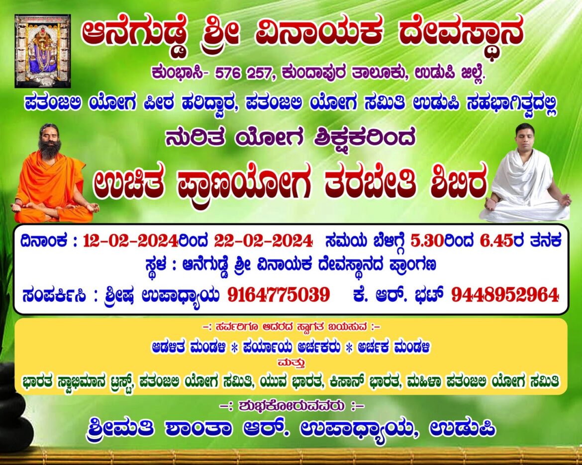 ಕುಂದಾಪುರ : ಇದೇ ತಿಂಗಳ 12.02.2024 ಸೋಮವಾರದಿಂದ 22.2.2024 ಗುರುವಾರ ತನಕ 10 ದಿನಗಳ ಪರ್ಯಂತ ಬೆಳಗ್ಗೆ 5.30 ರಿಂದ 6:45 ರ ತನಕ ಆನೆಗುಡ್ಡೆ ಶ್ರೀ ವಿನಾಯಕ ದೇವಳದ ಪ್ರಾಂಗಣದಲ್ಲಿ ಪತಂಜಲಿ ಯೋಗ ಪೀಠ ಹರಿದ್ವಾರ ಇದರ ನುರಿತ ಯೋಗ ಶಿಕ್ಷಕರಿಂದ ಉಚಿತ ಪ್ರಾಣಾಯಾಮ ಯೋಗ ಶಿಬಿರವನ್ನು ಆಯೋಜಿಸಲಾಗಿದೆ. ಕುಟುಂಬದ ಎಲ್ಲಾ ಸದಸ್ಯರು ಈ ಉಚಿತ ಶಿಬಿರದ ಪ್ರಯೋಜನವನ್ನು ಪಡೆಯಬೇಕಾಗಿ ಕೋರಲಾಗಿದೆ.