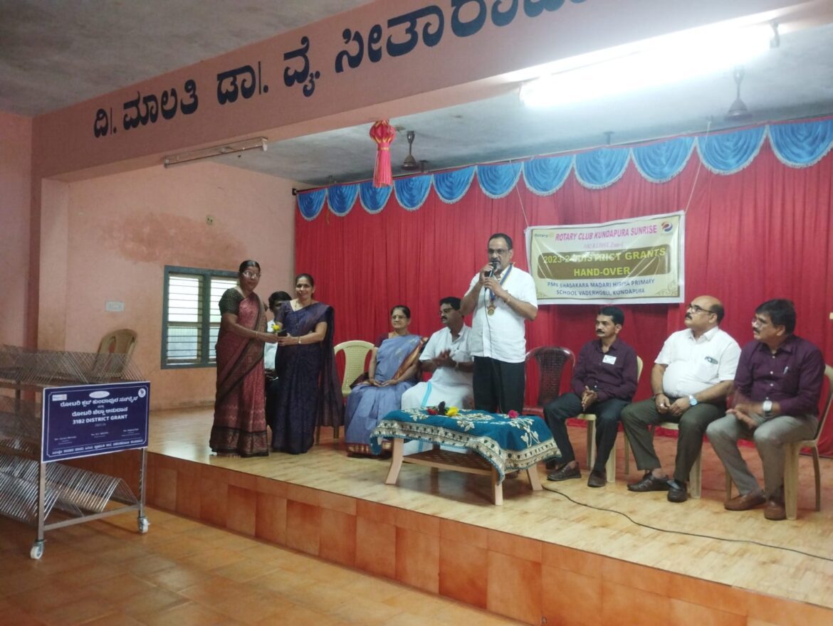 ಕುಂದಾಪುರ : ರೋಟರಿ ಕ್ಲಬ್ ಕುಂದಾಪುರ ಸನ್ ರೈಸ್ ಮತ್ತು ರೋಟರಿ 3182 ಜಿಲ್ಲಾ ಅನುದಾನ ಯೋಜನೆ ಅಡಿಯಲ್ಲಿ ಪಿ ಎಂ ಎಸ್ ಶಾಸಕರ ಮಾದರಿ ಹಿರಿಯ ಪ್ರಾಥಮಿಕ ಶಾಲೆ ವಡೇರಹೋಬಳಿ ಕುಂದಾಪುರ ಇಲ್ಲಿಗೆ ಸುಮಾರು ರೂ. 35000/- ರೂ. ಮೊತ್ತದ ಮಕ್ಕಳ ಊಟದ ಬಟ್ಟಲನ್ನು ಇಡುವ ಸ್ಟಾಂಡ್ ನೀಡಲಾಯಿತು.