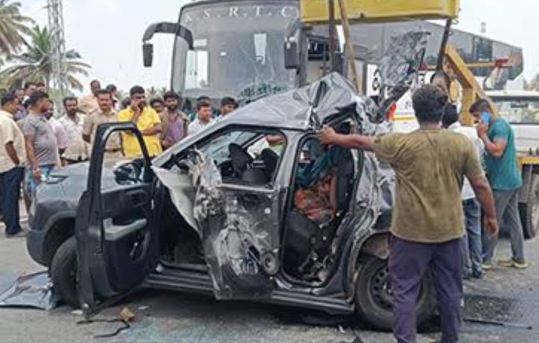 ಮಂಡ್ಯ : ಕಾರೊಂದಕ್ಕೆ ಹಿಂದಿನಿಂದ ವೇಗವಾಗಿ ಬಂದ ಐರಾವತ ಬಸ್ ಅಪ್ಪಳಿಸಿದ ಪರಿಣಾಮ ಕಾರಿನಲ್ಲಿದ್ದ ನಾಲ್ವರು ಸ್ಥಳದಲ್ಲೇ ಧಾರುಣ ವಾಗಿ ಮೃತಪಟ್ಟಿರುವ ಘಟನೆ ಬೆಂಗಳೂರು- ಮೈಸೂರು ಹೆದ್ದಾರಿಯ ತೂಬಿನಕೆರೆ ಬಳಿ ಗುರುವಾರ ನಡೆದಿದೆ.