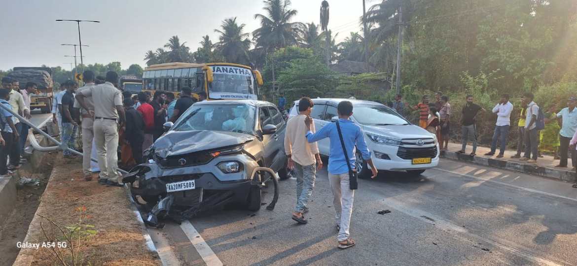 ಬೈಂದೂರು : ಮರವಂತೆ ಬಳಿಯ ನಾಗೂರಿನ ರಾಸ್ಟ್ರೀಯ ಹೆದ್ದಾರಿಯಲ್ಲಿ ಚಾಲಕನ ನಿಯಂತ್ರಣ ತಪ್ಪಿದ ಕಾರೊಂದು ಡಿವೈಡರ್ ಮೇಲೆ ಹತ್ತಿ ವಿದ್ಯುತ್ ಕಂಬಕ್ಕೆ ಡಿಕ್ಕಿ ಹೊಡೆದಿದೆ ನಾಗೂರು ಮಹಿಳಾ ಸಹಕಾರಿ ಸಂಘ ದ ಎದುರುಗಡೆ ನಡೆದ ಅಪಘಾತದಲ್ಲಿ ಕಾರಿನಲ್ಲಿದ್ದ 6 ಮಂದಿ ಸಣ್ಣ ಪುಟ್ಟ ಗಾಯಗಳೊಂದಿಗೆ ಪಾರಾಗಿದ್ದಾರೆ