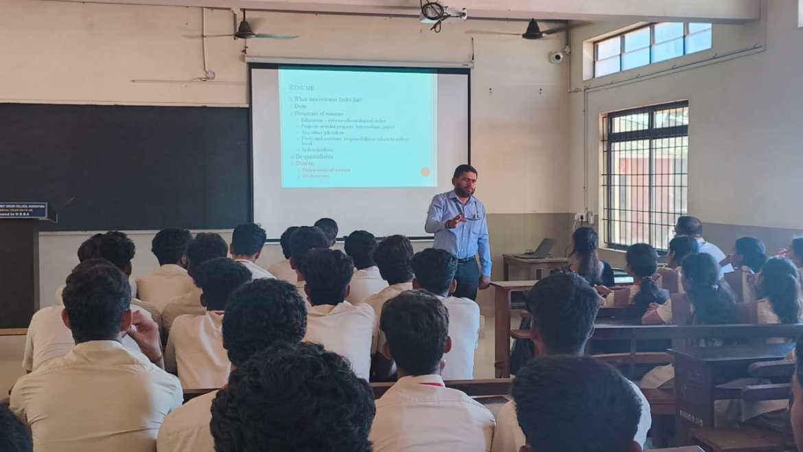 ಕಾಲೇಜಿನ ಗಣಕ ವಿಜ್ಞಾನ ವಿಭಾಗದ ಸಹ ಪ್ರಾಧ್ಯಾಪಕ ಹಾಗೂ ಡೀನ್ ಅಕಾಡೆಮಿಕ್ಸ್ ಶ್ರೀ ಗಿರಿರಾಜ್ ಭಟ್ ಅವರು ಸಂಪನ್ಮೂಲ ವ್ಯಕ್ತಿಯಾಗಿ ಭಾಗವಹಿಸಿ, ಪರಿಣಾಮಕಾರಿ ರೆಸ್ಯೂಮ್ ರಚನೆ, ವೃತ್ತಿಪರ ಪ್ರೊಫೈಲ್ ಅಭಿವೃದ್ಧಿ ಹಾಗೂ ಉದ್ಯೋಗಾವಕಾಶಗಳಿಗೆ ಸಿದ್ಧರಾಗುವ ಕುರಿತು ವಿದ್ಯಾರ್ಥಿಗಳಿಗೆ ಉಪಯುಕ್ತ ಮಾರ್ಗದರ್ಶನ ನೀಡಿದರು. ಇದೇ ಸಂದರ್ಭ ಅವರು ವಿದ್ಯಾರ್ಥಿಗಳಿಗೆ ಉದ್ಯೋಗ ಗಿಟ್ಟಿಸುವಲ್ಲಿ ಪ್ರಾಥಮಿಕ ಹಂತದಲ್ಲಿ ರೆಸ್ಯೂಮ್ ಅತ್ಯಂತ ಮಹತ್ವದ್ದಾಗಿದ್ದು, ಉತ್ತಮ ವ್ಯಕ್ತಿತ್ವದ ದರ್ಪಣವಾಗಿ ರೆಸ್ಯೂಮ್ ಮೂಡಿ ಬರಲಿ ಎಂದರು.