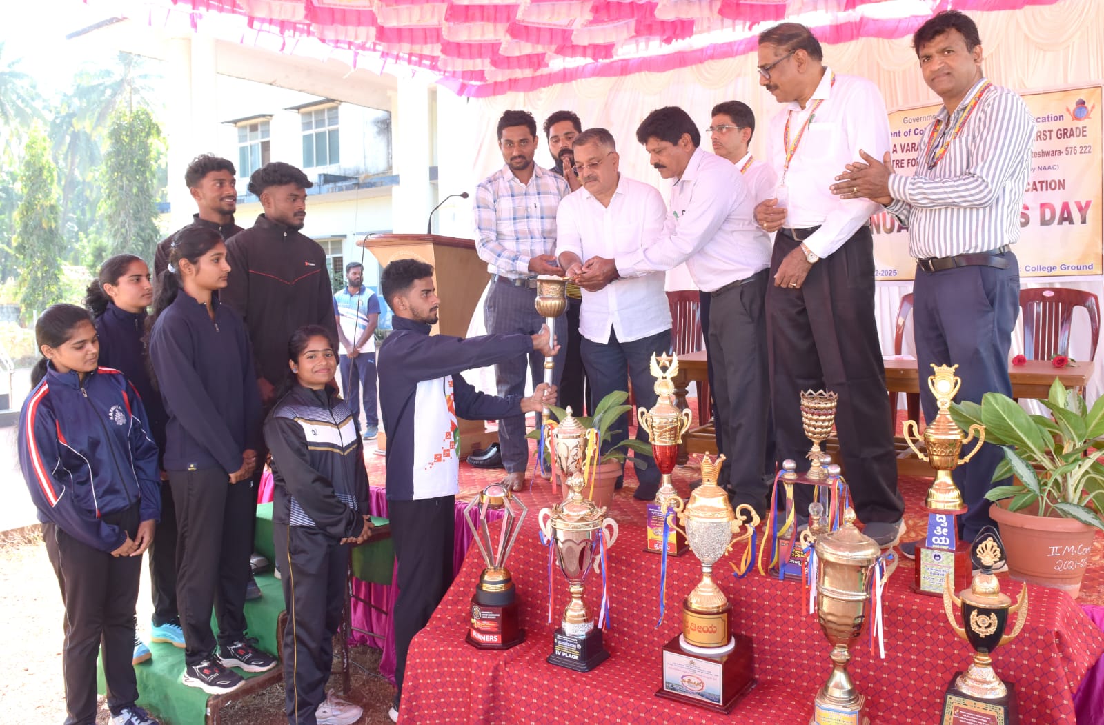 ಕಾರ್ಯಕ್ರಮದ ಅಧ್ಯಕ್ಷತೆಯನ್ನು ವಹಿಸಿದ್ಧ ಕಾಲೇಜಿನ ಪ್ರಾಂಶುಪಾಲರಾದ ರಾಮರಾಮ ಆಚಾರ್ಯ ಇವರು ಸಂತೋಷಕ್ಕೆ ಹತ್ತಿರದ ದಾರಿ ಆರೋಗ್ಯ. ಸದಾ ಆರೋಗ್ಯದಿಂದಿರಲು ಕ್ರೀಡೆ ಸಹಕಾರಿಯಾಗಿದ್ದು ವಿದ್ಯಾರ್ಥಿಗಳೆಲ್ಲ ಸಂಭ್ರಮದಿಂದ ಪಾಲ್ಗೊಂಡು ಕ್ರೀಡಾಕೂಟವನ್ನು ಯಶಸ್ವಿಗೊಳಿಸುವಂತೆ ಕರೆ ನಿಡಿದರು. ಐ.ಕ್ಯೂ.ಎ.ಸಿ. ಸಂಚಾಲಕರಾದ ನಾಗರಾಜ ಯು., ಕ್ರೀಡಾ ಸಮಿತಿಯ ವಿದ್ಯಾರ್ಥಿ ಪ್ರತಿನಿಧಿಗಳಾದ ಅಭಿಷೇಕ್, ಸಿಂಚನಾ, ಮೇಘನಾ ವೇದಿಕೆಯಲ್ಲಿ ಉಪಸ್ಥಿತರಿದ್ದರು.