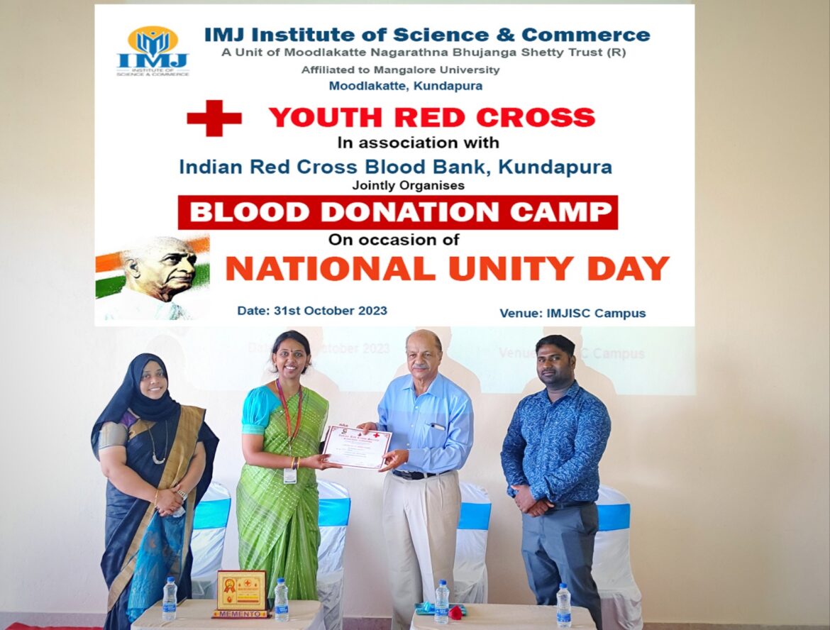 ಕಾರ್ಯಕ್ರಮದ ಅಧ್ಯಕ್ಷರಾದ, ಐ ಎಂ ಜೆ ವಿಜ್ಞಾನ ಮತ್ತು ವಾಣಿಜ್ಯ ಕಾಲೇಜಿನ ಪ್ರಾಂಶುಪಾಲೇಯವರಾದ ಡಾII ಪ್ರತಿಭಾ ಎಂ ಪಟೇಲ್ ಅವರು ತಮ್ಮ ಅಧ್ಯಕ್ಷಿಯ ಭಾಷಣದಲ್ಲಿ ರಾಷ್ಟೀಯ ಏಕತಾ ದಿನಾಚರಣೆಯ ಮಹತ್ವವನ್ನು ತಿಳಿಸಿದರು. ದೇಶದ ಏಕತೆಗಾಗಿ ಶ್ರಮಿಸಿದ ಸರ್ದಾರ್ ವಲ್ಲಭಾಯಿ ಪಟೇಲ್ ಅವರ ಕೊಡುಗೆಯನ್ನು ಸ್ಮರಿಸಲಾಯಿತು. ಸದ್ರಡ ದೇಶವನ್ನು ಕಟ್ಟುವ ನಿಟ್ಟಿನಲ್ಲಿ ವಿದ್ಯಾರ್ಥಿಗಳ ಪಾತ್ರವನ್ನು ತಿಳಿಸಿದರು ಈ ನಿಟ್ಟಿನಲ್ಲಿ ರಾಷ್ಟೀಯ ಏಕತಾ ದಿನಾಚರಯನ್ನು ಅರ್ಥಪೂರ್ಣವಾಗಿ ಆಚರಿಸುವ ಉದ್ದೇಶದಿಂದ ರಕ್ತದಾನ ಶಿಬಿರವನ್ನು ಹಮ್ಮಿಕೊಳ್ಳಲಾಗಿದೆ ಎಂದು ವಿವರಿಸಿದರು