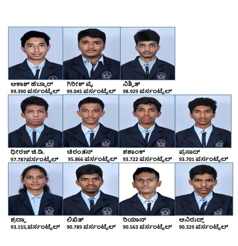 ಚಿರಂತನ್ 95.866 ಪರ್ಸಂಟೈಲ್,ಶಶಾಂಕ್ 93.722 ಪರ್ಸಂಟೈಲ್,ಪ್ರಸಾದ್ 93.701 ಪರ್ಸಂಟೈಲ್,ಶ್ರದ್ಧಾ 93.155,ಪರ್ಸಂಟೈಲ್, ಲಿಖಿತ್ 90.789 ಪರ್ಸಂಟೈಲ್,ರಿಯಾನ್ 90.563 ಪರ್ಸಂಟೈಲ್,ಅನಿರುದ್ದ್ 90.329 ಪರ್ಸಂಟೈಲ್ ಪಡೆದು ಜೆಇಇ ಅಡ್ವನ್ಸ್ ಪರೀಕ್ಷೆಗೆ ಅರ್ಹತೆ ಪಡೆದಿದ್ದಾರೆ.