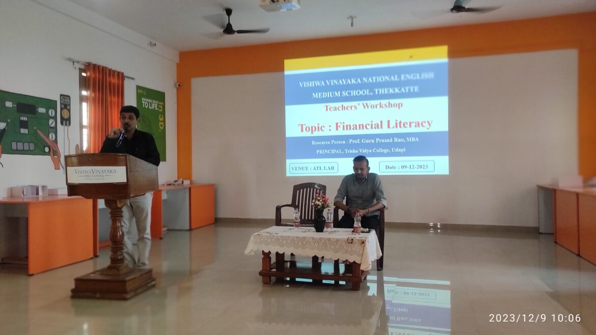 ತೆಕ್ಕಟ್ಟೆ : ವಿಶ್ವ ವಿನಾಯಕ ಸಿ.ಬಿ.ಎಸ್.ಇ ಸ್ಕೂಲ್ನಲ್ಲಿ ಶಿಕ್ಷಕರಿಗೆ “ಫೈನಾನ್ಸಿಯಲ್ ಲಿಟರಸಿ” ಕುರಿತು ಒಂದು ದಿನದ ತರಭೇತಿ ಕಾರ್ಯಾಗಾರವನ್ನು ಆಯೋಜಿಸಲಾಯಿತು. ತ್ರಿಶಾ ಕಾಲೇಜು ಉಡುಪಿ ಇದರ ಪ್ರಾಂಶುಪಾಲರಾದ ಪ್ರೊಫೆಸರ್ ಗುರುಪ್ರಸಾದ್ ರಾವ್ರವರು ಸಂಪನ್ಮೂಲ ವ್ಯಕ್ತಿಯಾಗಿ ಆಗಮಿಸಿದ್ದರು. ಶೇರು ಹೂಡಿಕೆ, ಜೀವ ವಿಮೆ ಹಾಗೂ ಭವಿಷ್ಯದ ಸುರಕ್ಷತಾ ದೃಷ್ಠಿಯಿಂದ ಮಾಡುವ ವಿವಿಧ ಹೂಡಿಕೆಗಳ ಕುರಿತು ಮಾಹಿತಿ ನೀಡಿದರು. ಡಿಜಿಟಲ್ ಪೇಮೆಂಟ್ ಹಾಗೂ ಅದರ ಸಾಧಕ ಭಾದಕಗಳ ಕುರಿತು ವಿವರಿಸಿದರು.