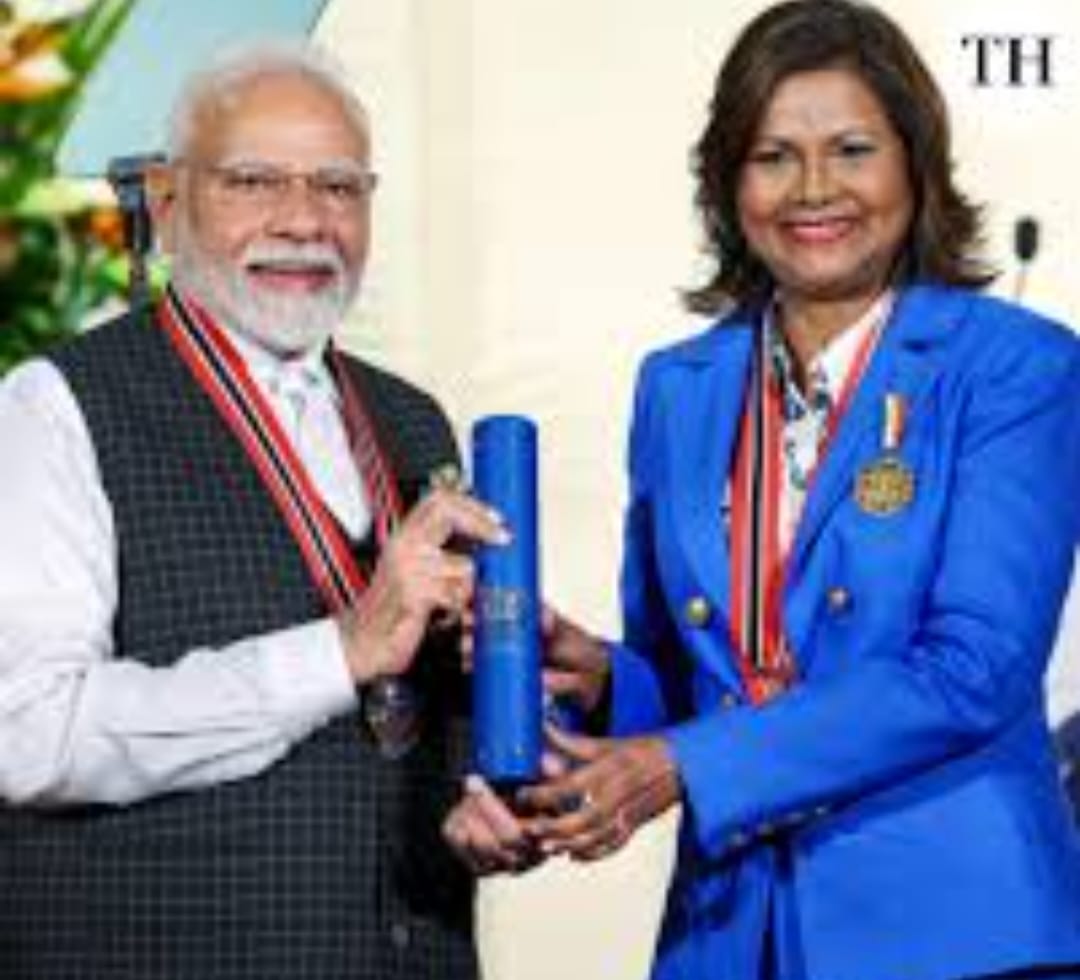 ಪೋರ್ಟ್ ಆಫ್ ಸ್ಪೇನ್ : 5 ರಾಷ್ಟ್ರಗಳ ಪ್ರವಾಸದಲ್ಲಿರುವ ಪ್ರಧಾನಿ ನರೇಂದ್ರ ಮೋದಿ ಅವರಿಗೆ ಟ್ರಿನಿಡಾಡ್ ಮತ್ತು ಟೊಬಾಗೊ ದೇಶ ಶುಕ್ರವಾರ ತನ್ನ ಅತ್ಯುನ್ನತ ನಾಗರಿಕ ಪ್ರಶಸ್ತಿ ನೀಡಿ ಗೌರವಿಸಿದೆ. ಇದು ಪ್ರಧಾನಿ ನರೇಂದ್ರ ಮೋದಿ ಅವರಿಗೆ ದೊರೆತ 25ನೇ ಅಂತಾರಾಷ್ಟ್ರೀಯ ಗೌರವ.