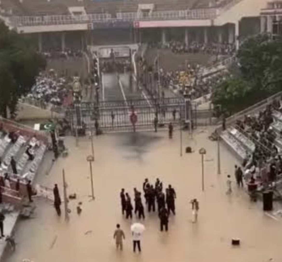 ಅಮೃತಸರ : ಕಳೆದ ಕೆಲವು ದಿನಗಳಿಂದ ಉತ್ತರ ಭಾರತ ಮತ್ತು ಪಾಕಿಸ್ತಾನದಲ್ಲಿ ಭಾರೀ ಮಳೆಯಾಗುತ್ತಿದೆ. ಇದರಿಂದಾಗಿ, ಹಲವೆಡೆ ಅವಾಂತರಗಳು ಸೃಷ್ಟಿಯಾಗಿರುವ ನಡುವೆಯೇ, ಪಾಕಿಸ್ತಾನದ ವಾಘಾ ಗಡಿಯಲ್ಲಿ ನೀರು ತುಂಬಿಕೊಂಡು ಮುಜುಗರದ ಸಂದರ್ಭವೊಂದು ಸೃಷ್ಟಿಯಾಗಿದೆ.