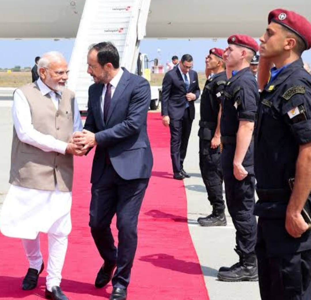 ಮೊದಲ ಭೇಟಿಯಾಗಿ ಸೈಪ್ರಸ್ಗೆ ತೆರಳಿದ್ದಾರೆ. ಎರಡು ದಶಕದ ಬಳಿಕ ಭಾರತ ಪ್ರಧಾನಿಯೊಬ್ಬರು ಸೈಪ್ರಸ್ಗೆ ನೀಡುತ್ತಿರುವ ಮೊದಲ ಭೇಟಿ ಇದಾಗಿದ್ದು, ವಿಮಾನ ನಿಲ್ದಾಣದಲ್ಲಿ ಪ್ರಧಾನಿ ಮೋದಿ ಮೋದಿಗೆ ಅಧ್ಯಕ್ಷರಿಂದ ಅದ್ಧೂರಿ ಸ್ವಾಗತ ದೊರೆಯಿತು.