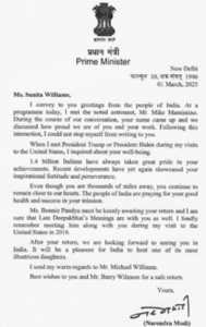ಸುನೀತಾ ತಾಯಿ, ಬೋನಿ ಪಾಂಡ್ಯ, ಆಕೆಯ ಮರಳುವಿಕೆಯನ್ನು ಕುತೂಹಲದಿಂದ ಕಾಯುತ್ತಿರಬಹುದು ಎಂದೂ ಅವರು ಹೇಳಿದ್ದಾರೆ. ಮಿಸ್ ವಿಲಿಯಮ್ಸ್ ಮತ್ತು ಅವರ ಸಹೋದ್ಯೋಗಿ ಬುಚ್ ವಿಕ್ಟೋರ್ ಅವರು 17 ಗಂಟೆಗಳ ಪ್ರಯಾಣಕ್ಕಾಗಿ ಐಎಸ್ಎಸ್ನಿಂದ ಹೊರಟ ಕೆಲವೇ ಗಂಟೆಗಳ ನಂತರ ಈ ಪತ್ರವನ್ನು ಸಾರ್ವಜನಿಕಗೊಳಿಸಲಾಯಿತು. ನೀವು ಹಿಂದಿರುಗಿದ ನಂತರ, ನಿಮ್ಮನ್ನು ಭಾರತದಲ್ಲಿ ನೋಡಲು ನಾವು ಎದುರು ನೋಡುತ್ತಿದ್ದೇವೆ. ಭಾರತ ತನ್ನ ಅತ್ಯಂತ ಪ್ರಸಿದ್ಧ ಹೆಣ್ಣುಮಕ್ಕಳಲ್ಲಿ ಒಬ್ಬಳಿಗೆ ಆತಿಥ್ಯ ನೀಡುವುದು ಸಂತೋಷದ ಸಂಗತಿ, ಎಂದೂ ಅವರು ಹೇಳಿದ್ದಾರೆ. ಮೋದಿ ಅವರು ಸುನಿತಾ ಪತಿ ಮೈಕೆಲ್ ವಿಲಿಯಮ್ಸ್ ಅವರಿಗೂ ಆತ್ಮೀಯ ಶುಭಾಶಯಗಳನ್ನು ತಿಳಿಸಿದ್ದಾರೆ.