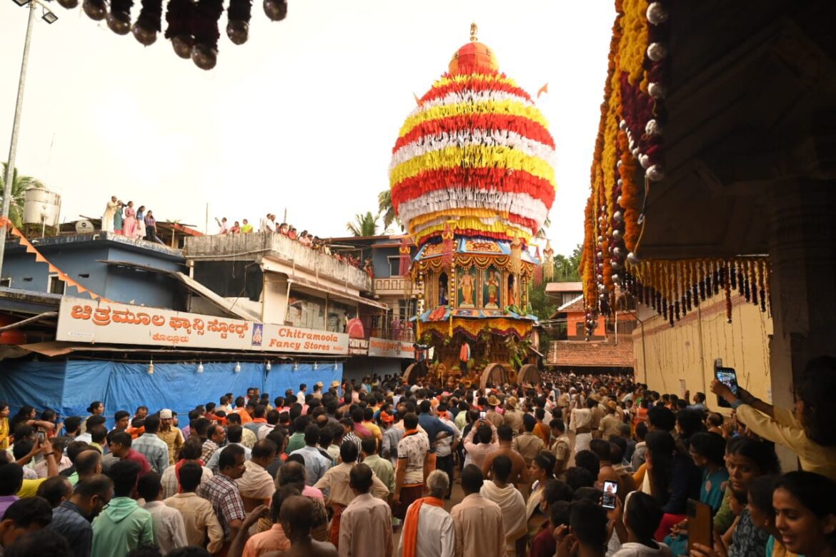 ಕುಂದಾಪುರ: ದಕ್ಷಿಣ ಭಾರತದ ಪ್ರಸಿದ್ಧ ಶಕ್ತಿ ಪೀಠಗಳಲ್ಲಿ ಒಂದಾದ ಕೊಲ್ಲೂರು, ಶ್ರೀ ಮೂಕಾಂಬಿಕಾ ದೇವಿಯ ಅಷ್ಟಬಂಧ ಬ್ರಹ್ಮಕಲಶೋತ್ಸವ ಪ್ರಯುಕ್ತ ಮಂಗಳವಾರ ವೈಭವದ ಶ್ರೀ ಮನ್ಮಹಾ ರಥೋತ್ಸವ ಸಂಭ್ರಮ ಸಡಗರದಿಂದ ನಡೆಯಿತು.ದೇವಳದ ತಂತ್ರಿ, ಪ್ರಧಾನ ಅರ್ಚಕ ಡಾ.ಕೆ.ನಿತ್ಯಾನಂದ ಅಡಿಗರ ನೇತೃತ್ವದಲ್ಲಿ ಮುಹೂರ್ತ ಮಂಗಳಾರತಿ, ಪಂಚಾಮೃತ ಅಭಿಷೇಕ, ಕ್ಷಿಪ್ರ ಬಲಿ, ವಿಶೇಷ ಭೂತಬಲಿ, ರಥಾರೋಹಣ ಸೇರಿದಂತೆ ಹಲವು ಧಾರ್ಮಿಕ ವಿಧಿವಿಧಾನ ಜರುಗಿತು. ವಿವಿಧ ಭಾಗಗಳಿಂದ ಕ್ಷೇತ್ರಕ್ಕೆ ಆಗಮಿಸಿದ ಸಹಸ್ರಾರು ಭಕ್ತರು ಮಧ್ಯಾಹ್ನ ದೇವಳದ ಭೋಜನ ಶಾಲೆಯಲ್ಲಿ ಅನ್ನಪ್ರಸಾದ ಸ್ವೀಕರಿಸಿದರು. ಸಂಜೆ ನಡೆದ ರಥೋತ್ಸವದಲ್ಲಿ ಸಾವಿರಾರು ಭಕ್ತರು ರಥ ಎಳೆಯುವ ಹಾಗೂ ರಥಕ್ಕೆ ಬಾಳೆಹಣ್ಣು ಎಸೆಯುವ ಮೂಲಕ ಸಂಭ್ರಮಿಸಿದರು ಸುಮಾರು ೨೦ ವರ್ಷ ನಂತರ ೧೧ ದಿನಗಳ ಕಾಲ ನಡೆಯುತ್ತಿರುವ ಅಷ್ಟಬಂಧ ಬ್ರಹ್ಮಕಲಶೋತ್ಸವ ಏ.೩೦ ರಂದು ಆರಂಭಗೊAಡಿದ್ದು, ಮೇ ೧೧ ರಂದು ಸಂಪನ್ನಗೊಳ್ಳಲಿದೆ. ಕೊಲ್ಲೂರು ಕ್ಷೇತ್ರದ ಅಧಿದೇವತೆ ಹಾಗೂ ಗ್ರಾಮ ದೇವತೆ ಶ್ರೀ ಮೂಕಾಂಬಿಕಾ ಅಮ್ಮನವರ ರಥೋತ್ಸವಕ್ಕೆ ಮೇ ೨ ರಂದು ಧ್ವಜಾರೋಹಣದೊಂದಿಗೆ ಚಾಲನೆ ನೀಡಲಾಗಿತ್ತು. ರಥೋತ್ಸವದ ಪ್ರಯುಕ್ತ ಊರಿನ ಹತ್ತು ಸಮಸ್ತರು, ಭಕ್ತಾಧಿಗಳು ಸೇರಿ ಅಂಗಡಿ ಮುಂಗಟ್ಟು ಮನೆ, ಬೀದಿಗಳನ್ನು ವಿಶೇಷ ವಿದ್ಯುದ್ವೀಪಗಳಿಂದ ಅಲಂಕರಿಸಿದ್ದರು.