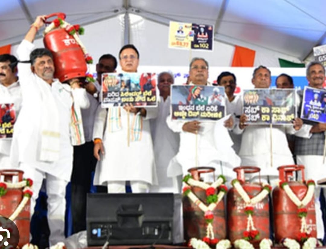 ಬೆಂಗಳೂರು : ಗ್ಯಾಸ್ ಸಿಲಿಂಡರ್ಗೆ ಹಾರ ಹಾಕಿದ ಮುಖ್ಯಮಂತ್ರಿ ಸಿದ್ದರಾಮಯ್ಯ, ಹೆಗಲ ಮೇಲೆ ಸಿಲಿಂಡರ್ ಹೊತ್ತ ಉಪಮುಖ್ಯಮಂತ್ರಿ ಡಿ.ಕೆ.ಶಿವಕುಮಾರ್, ಪ್ಲೆಕಾರ್ಡ್ ಹಿಡಿದ ರಾಜ್ಯ ಕಾಂಗ್ರೆಸ್ ಉಸ್ತುವಾರಿ ರಣದೀಪ್ ಸುರ್ಜೇವಾಲಾ, ಕೇಂದ್ರ ಸರ್ಕಾರ ಮತ್ತು ಪ್ರಧಾನಿ ನರೇಂದ್ರ ಮೋದಿ ಹಾಗೂ ವಿತ್ತ ಸಚಿವೆ ನಿರ್ಮಲಾ ಸೀತಾರಾಮನ್ ವಿರುದ್ಧ ಮೊಳಗಿದ ಘೋಷಣೆಗಳು.