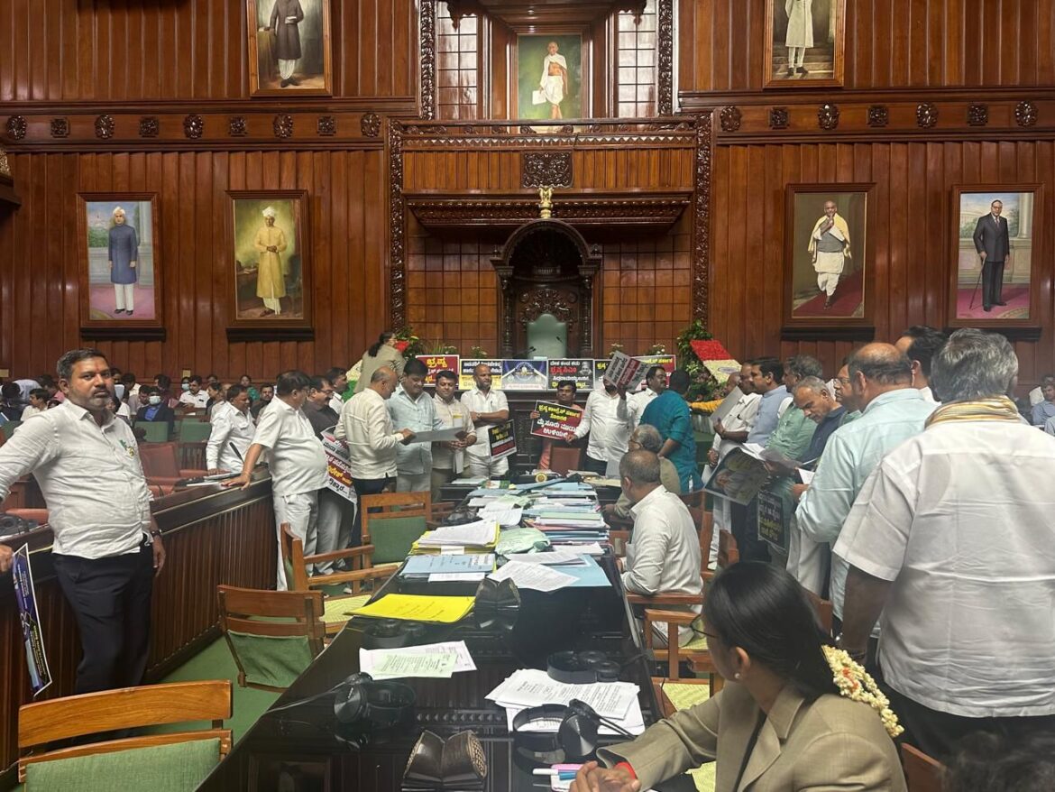ಬೆಂಗಳೂರು : ಮುಡಾ ನಿವೇಶನಗಳ ಅಕ್ರಮ ಹಂಚಿಕೆ ಹಗರಣದ ಬಗ್ಗೆ ಚರ್ಚೆಗೆ ಅವಕಾಶ ನೀಡುವಂತೆ ಕೋರಿ ಪ್ರತಿಪಕ್ಷಗಳಾದ ಬಿಜೆಪಿ ಮತ್ತು ಜೆಡಿಎಸ್ ಪಟ್ಟು ಬಿಡದ ಹಿನ್ನೆಲೆಯಲ್ಲಿ ವಿಧಾನಮಂಡಲ ದಲ್ಲಿ ಕೋಲಾಹಲ ಸೃಷ್ಟಿಯಾಗಿ ಕೊನೆಗೆ ಉಭಯ ಸದನಗಳ ಕಲಾಪವೇ ಬಲಿಯಾಯಿತು.